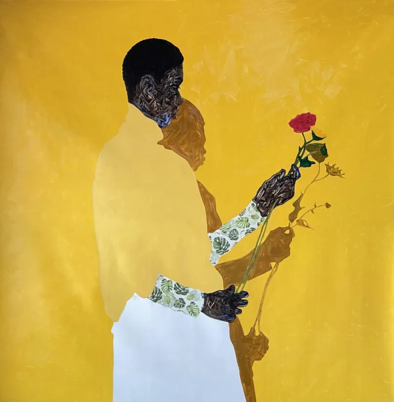 I am staring up at Amoako Boafo's Monstera Leaf Sleeves. In numbers, it is defined as a 82.68 x 70.87 in. oil painting. But it is more than that. Like gazing upon the deep blue sky, or a sprawling redwood forest, the painting envelopes the reader in its depth. It is awe-inspiring, beautiful, and unbelievably stirring.